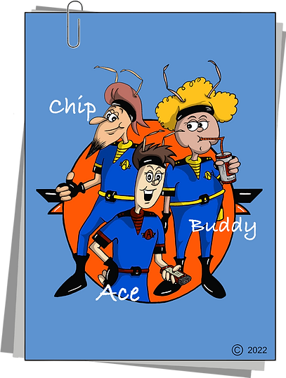 Meet our three heroes, Ship Captain Ace Adams, Communications Officer Chip McGee and Pilot Officer, Buddy Rayne. Long time members of T.A.P. (The Ant Patrol), our heroes share their exciting adventures that takes them across the vast underground world of Antica. There, led by the brave and valiant, Capt. Ace Adams, they will battle against the forces that threaten to bring chaos, mayhem and insecurity to their home city, Antropolis. They'll pit their wits, skills and courage against the likes of Dr. Marcos and Lord Vaine to ensure that those wily criminals never accomplish their devious plans. Their adventures will also take them into lawless regions such as the underground Outzone Territory and the unexplored and dangerous Wildlands where large merciless and savage creatures roam about forever searching for their next unwitting meal. Never fear, our heroes are always willing and able to tackle any task that threatens the safety and security of all the citizens of Antropolis.